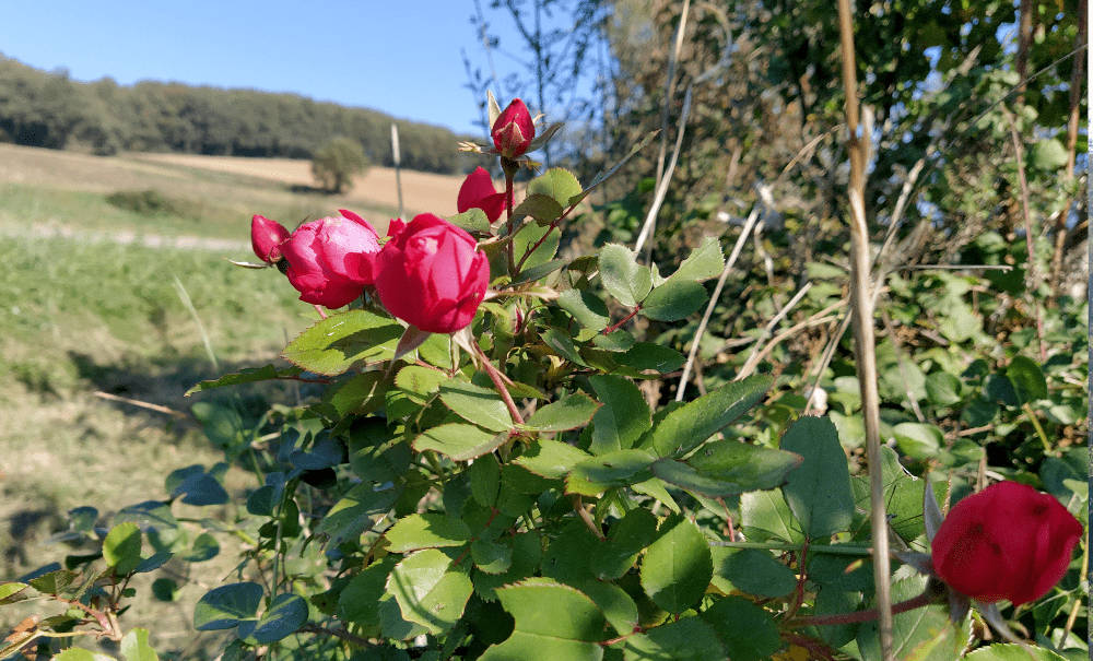 Enfin, on terminera sur des fleurs. On est un peu déçu par les topinambours, qui se fanent sans avoir fleurit. Mais on retrouve le sourire en voyant des calendulas au niveau du talus (qui aurait dû être des coquelicot semés au printemps). Les euphorbes qui les accompagnent sont majestueuses. Et les rosiers dans les haies (Jean-Luc et zone prairie) promettent un futur radieux.