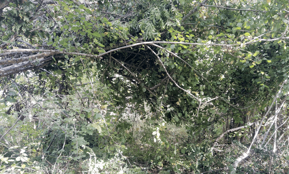 En s’écroulant, il s’est écrasé sur les arbres de notre rive et obstrue entièrement le passage.