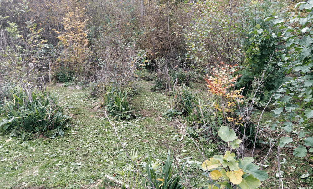 Entre deux, on a également débroussaillé la zone sauvage. Les repousses devenaient problématiques surtout à cause des taupes et campagnols qui s’y développent tranquillement. Encore une tonte marquée par les couleurs de la boue… Notons que cette éclaircissement a également pour objectif d’accueillir les feuilles mortes de nos pionniers. Et le résultat commence à se faire sentir.