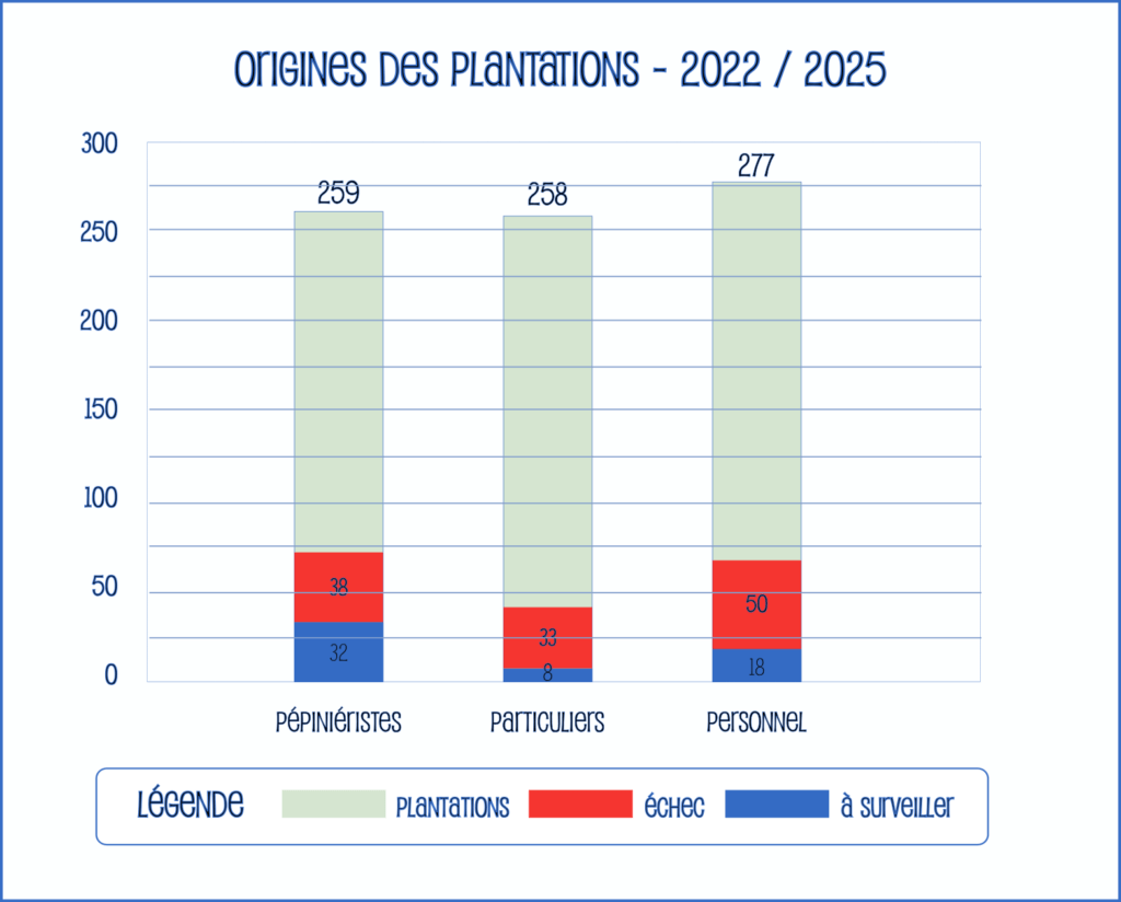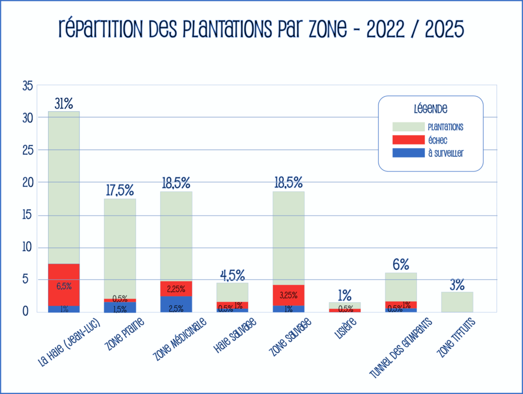 Sans surprise, c’est à notre arrivée, en 2022 qu’on a réalisé le plus de plantation. Le graphique ci-contre présente également le nombre d’échec ou de plants à surveiller. Bien entendu, comme nous ne pouvons pas prévoir les échecs à venir, il reste indicatif, ne serait-ce que pour les saisons de 2025.
