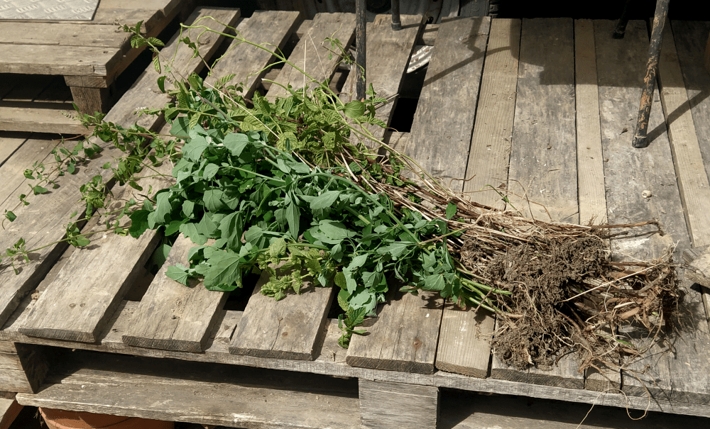 On repique de la menthe, de la sauge ananas et du chénopode dans des pots.