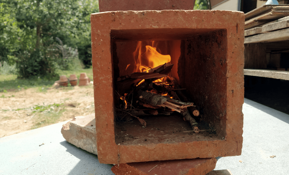 On commence par tester avec un petit café. Rapidement, sous l’effet de la chaleur, un des bloc s’est fendu… Il faut repenser le système pour qu’il soit plus pérenne. Alors on se dit qu’avec un conduit et une couche de torchis, on gagnerait en isolation.