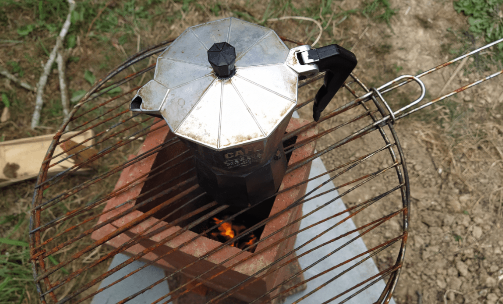 On se refait 2 cafés, histoire de re-tester l’ouvrage : l’un avec cheminée et l’autre sans. Il semblerait que ça ne change rien pour l’isolation. Par contre, le flux de fumée semble différent (mais les journées sont venteuses). On en conclut qu’il va nous falloir plusieurs autres cafés pour fignoler notre rocket oven (et trouver un vrai support de cuisson).