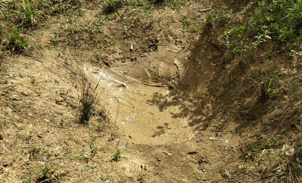 On ajoute quelques seaux de glaise au fond (pour remonter le niveau). On attend qu’elle s’assèche puis on ajoute de l’argile. On tasse le tout à la masse. Et au bout de quelques jours, le fond est moins mouvant.