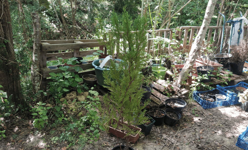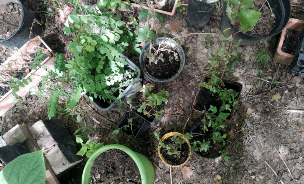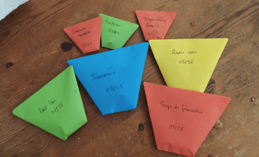 On déplace quelques pionniers (peuplier, acacias, sureau) qu’on réserve pour une future implantation. Puis on bouture du thuya et du fusain japon. Et à défaut d’avoir des récoltes, on récupère le peu de graines qui ont réussi à monter.
