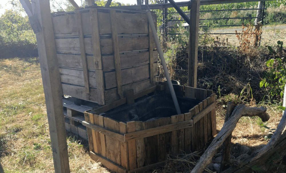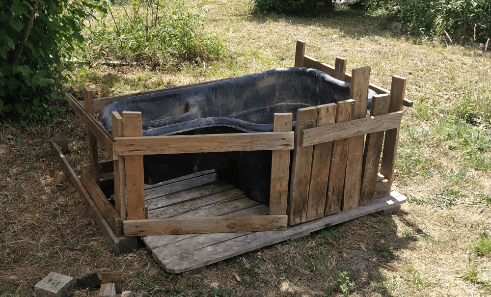 Et qui dit : plus d’eau, dit : trop-plein assez-vide. Donc encore le bon moment pour repenser le système. On hésite toujours à creuser des tranchées pour faire descendre le surplus avec des tuyaux, à mi-parcours entre la cuve et les réservoirs. Mais en attendant, on commence par agrandir nos capacités de stockage avec l’installation du bassin qu’on habille pour l’occasion.