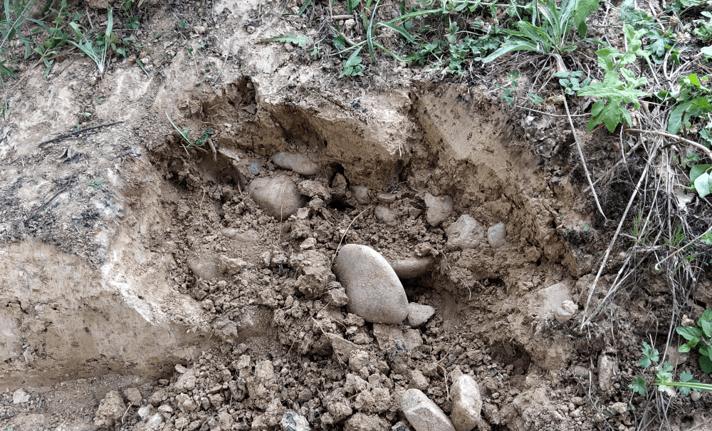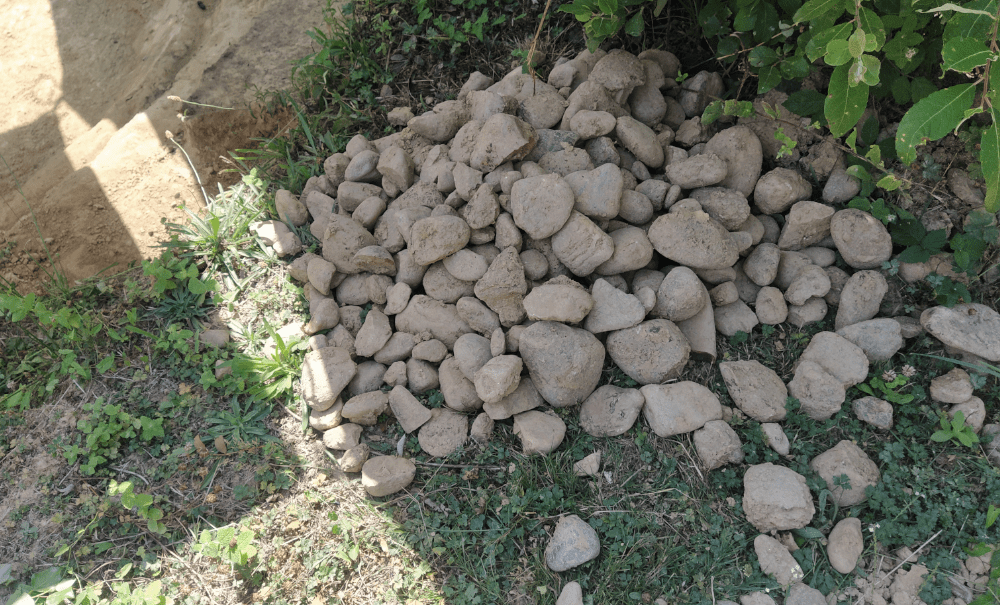 Et paf, là… gros problème!!! Des cailloux à profusion! Y’a même des galets (dommage qu’ils ne soient pas en or)! Pour y voir plus clair, on est obligé d’en retirer un maximum. On se retrouve avec une grosse cavité (et un tas de cailloux) qu’on va tenter de colmater (au moins en partie).