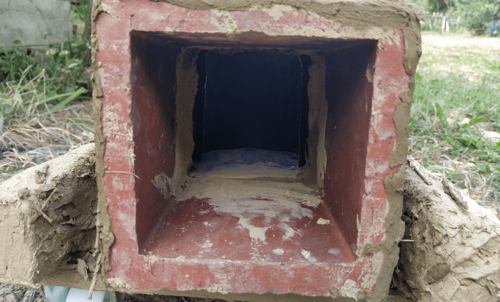 On fixe les blocs avec un mortier maison (argile/sable) et on les pose sur une tablette à roulettes (toujours fabrication maison) pour qu’il soit facilement déplaçable. Car une des contraintes du système, c’est qu’il faut le disposer face au vent.