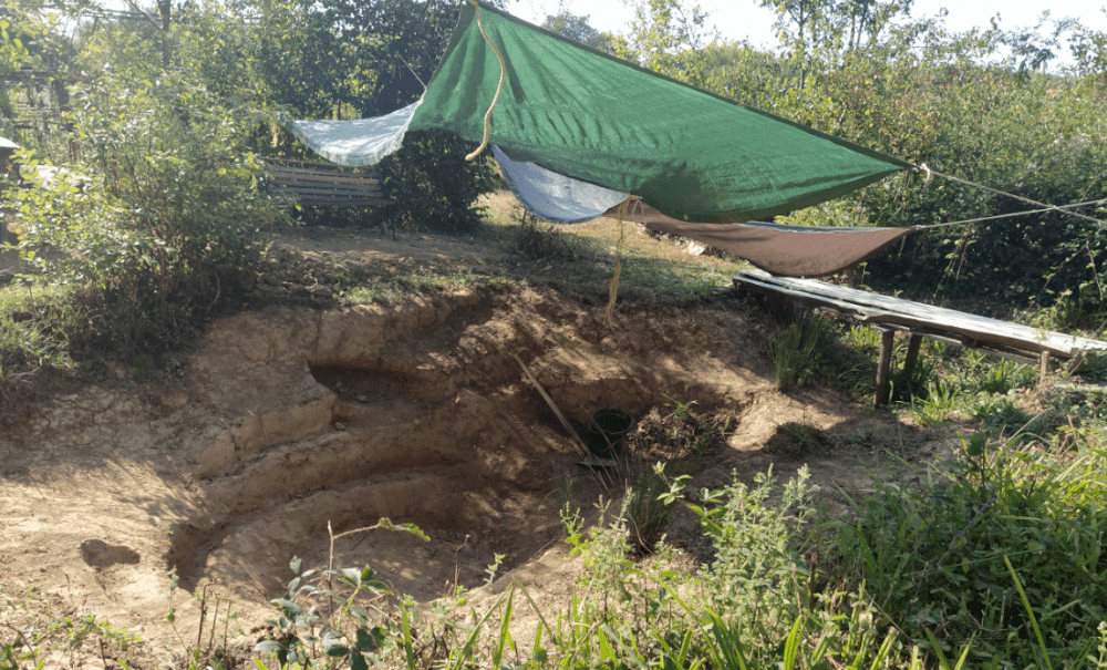 Puis on creuse nos marches disparurent dans l’affaissement de la terre. L’excédent de terre est utilisée pour compléter, selon sa teneur en argile : le fond (encore) et le futur boulodrome (!?).
