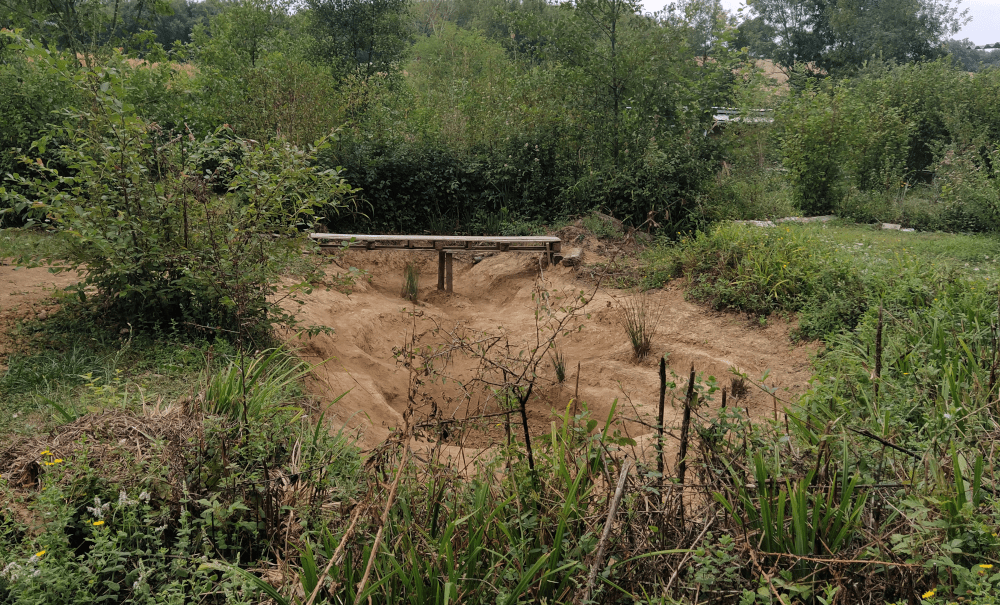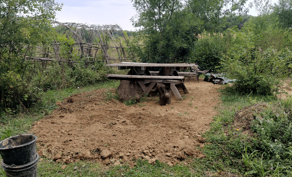 Entre deux rayons de soleil, on continue le nettoyage de l’espace aquatique. Le surplus de terre est déversé au dessus pour prolonger la zone pique-nique. On rectifie l’écoulement du trop plein, puis on consolide les marches du petit pont.
