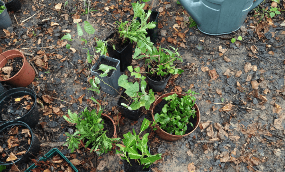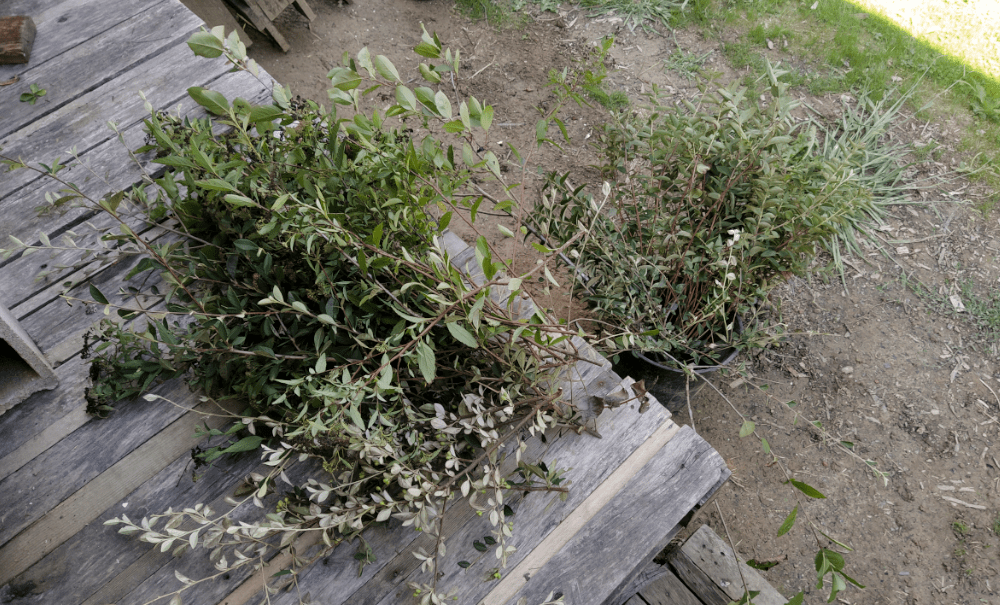 Qui dit plantation, dit bouture. Pour ce faire, on en récupère des branchouilles : sur place (dans la haie, Jean-Luc) qu’on repique à moitié dans nouvelles haies. Puis on s’arrête chez un voisin (Merci Sylvain!) pour du laurier cerise, clématite, abutilon d’avicenne, euryops à fleurs chrysanthème, deutzia, lilas des indes, raisin d’Amérique.