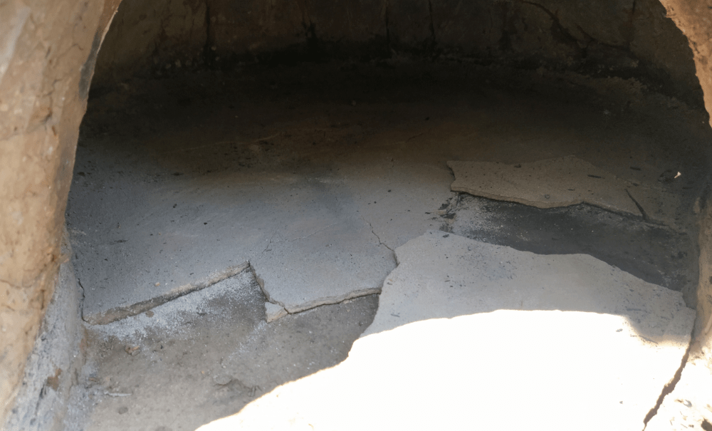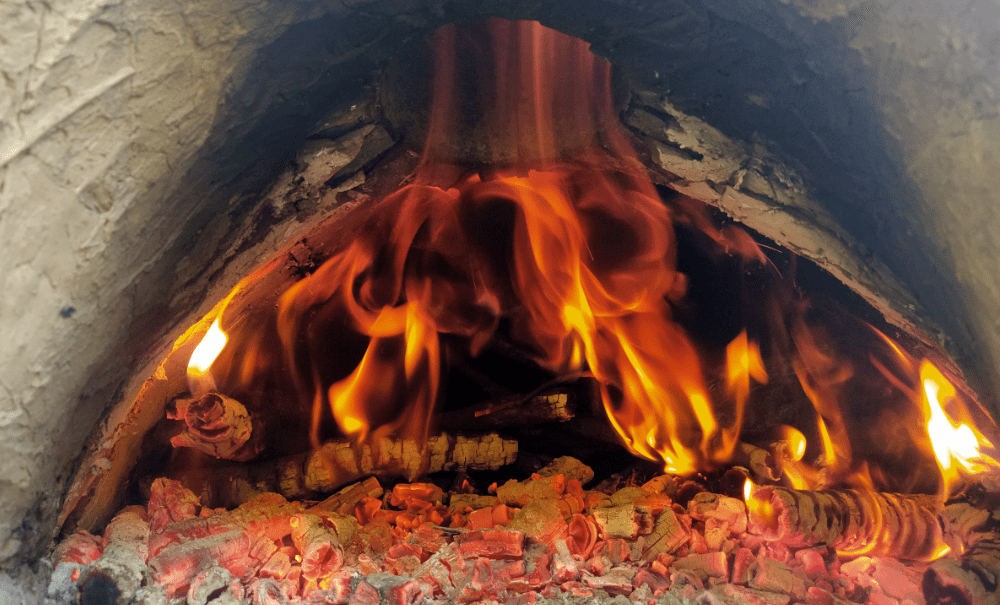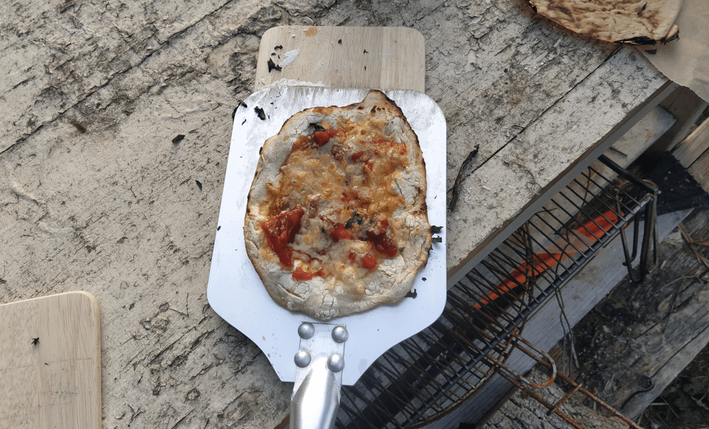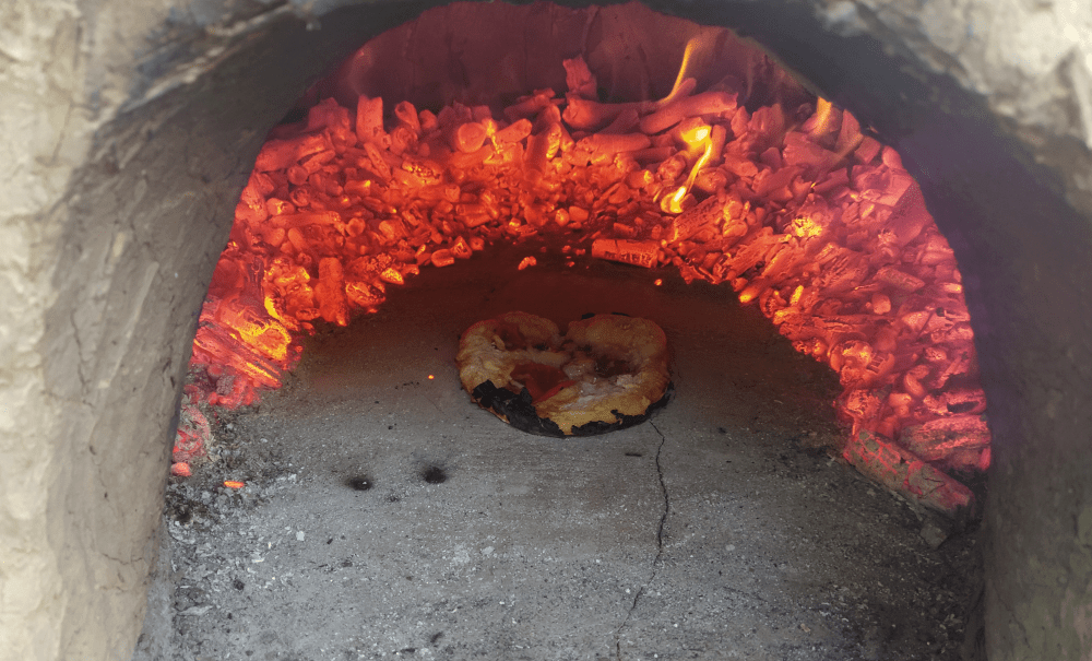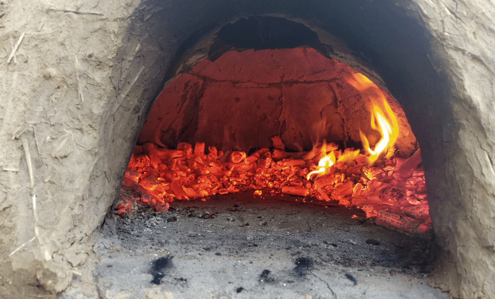 Puisqu’il fait moins chaud, on chauffe pour la deuxième fois le four. L’ensemble étant bien sec, on décide de le monter en température progressivement. L’objectif est de faire passer la couleur de la voûte du noir au blanc puis à l’orange. Au bout de quelques heures, on tentera la cuisson de mini-pizza et ça le fait!