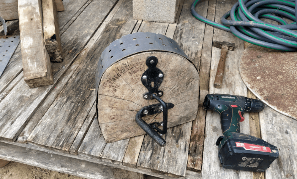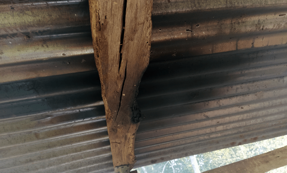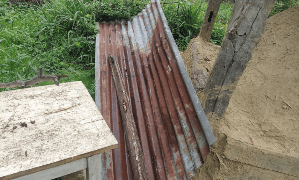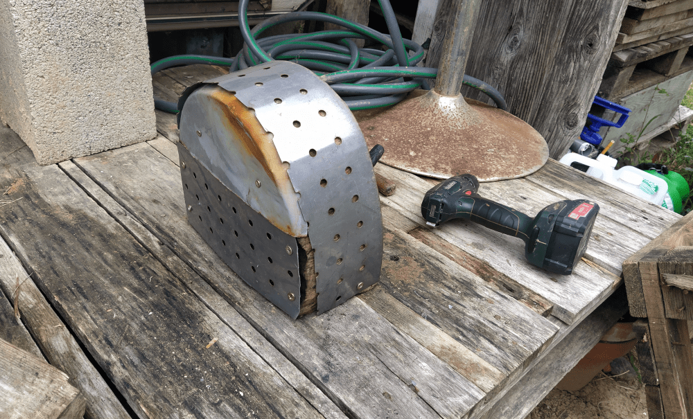 Pour la porte, c’est facile, on la protège en l’entourant de ferraille. Pour la poutre, c’est plus long. Quitte à la consolider (et ajouter un « chapeau d’évacuation »), on va améliorer la toiture. Car on sait depuis le début, qu’elle n’est pas assez large pour protéger les bords du four. Donc, il faut ajouter une tôle ondulée et une gouttière (pour mieux gérer l’écoulement des eaux de pluie vers l’espace aquatique).