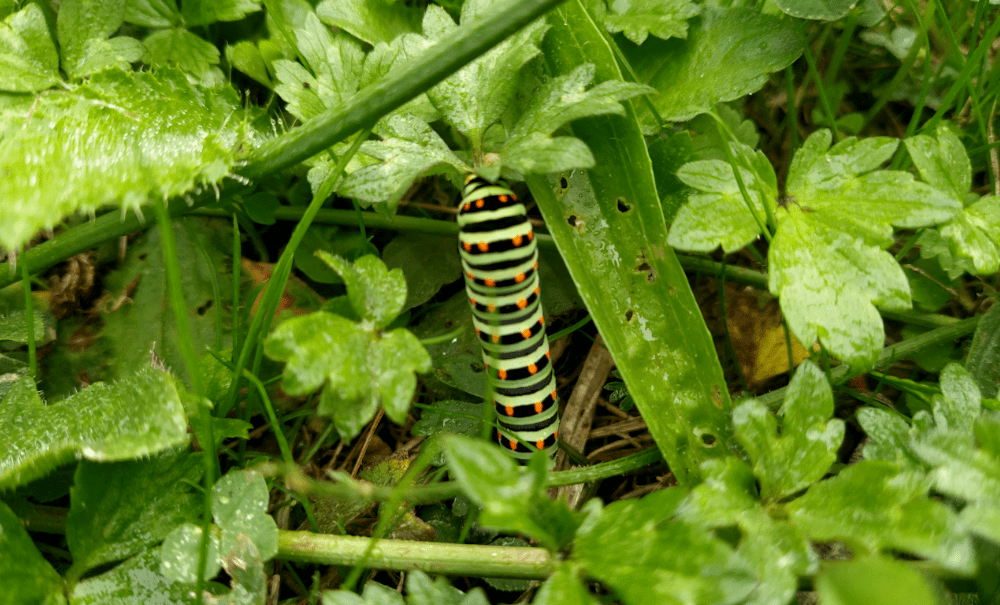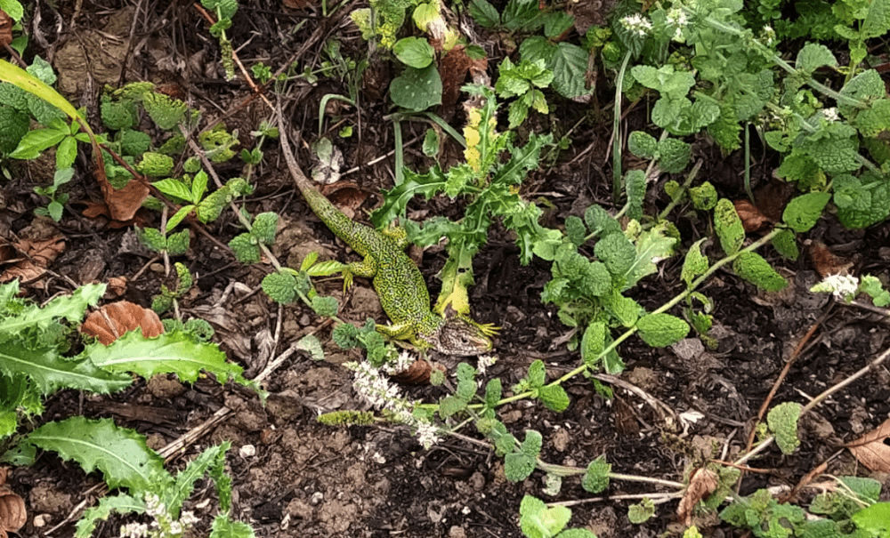 Aussi, on a réussi à faire une photo d’un gros lézard vert (difficile à approcher sans zoom), d’une chenille de machaon et du bombyx de la ronce (probablement).