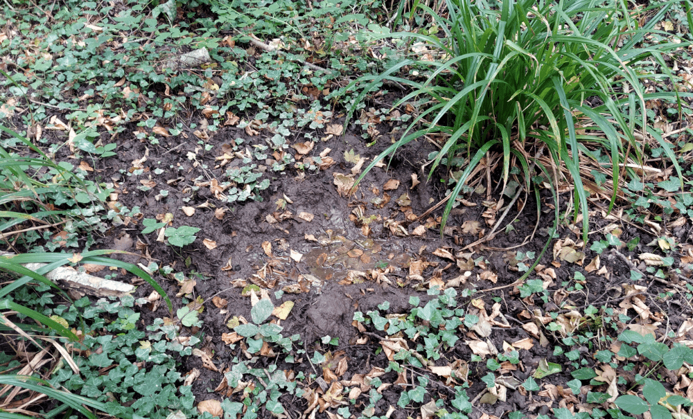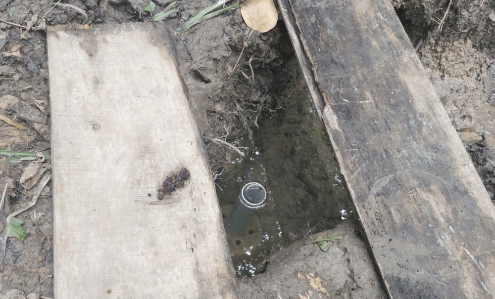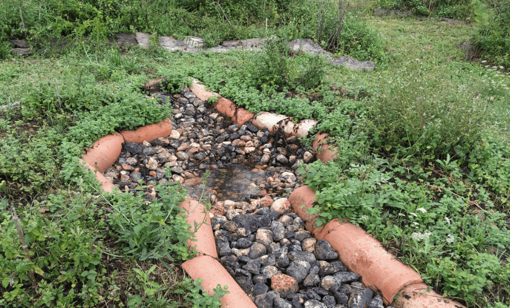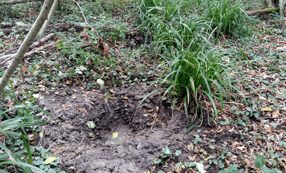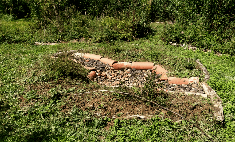 Puis pour protéger le fond de notre trou, on place 2 pots traversés par un tuyau (solution temporaire, le temps de continuer l’observation). On met également des planches pour éviter que les animaux n’y tombent. D’ailleurs, dès qu’on aura terminé cette étude, on aménagera un beau petit point d’eau pour redonner l’accès à qui de droit.