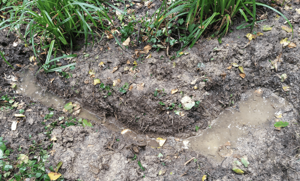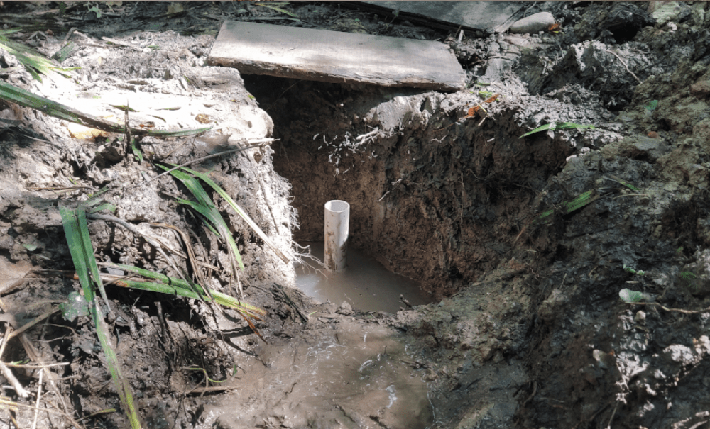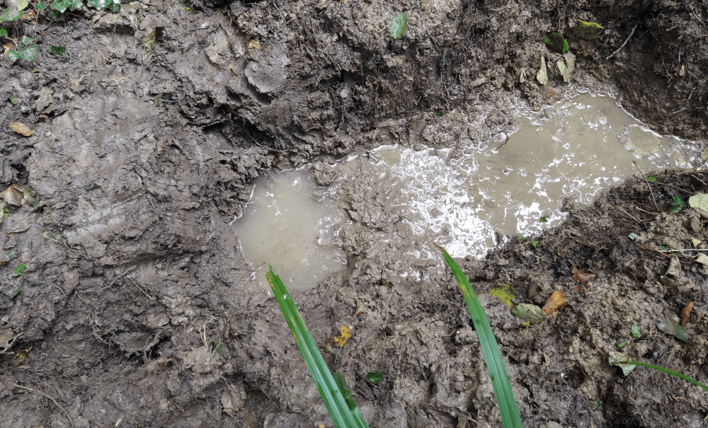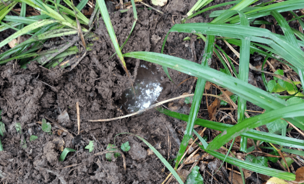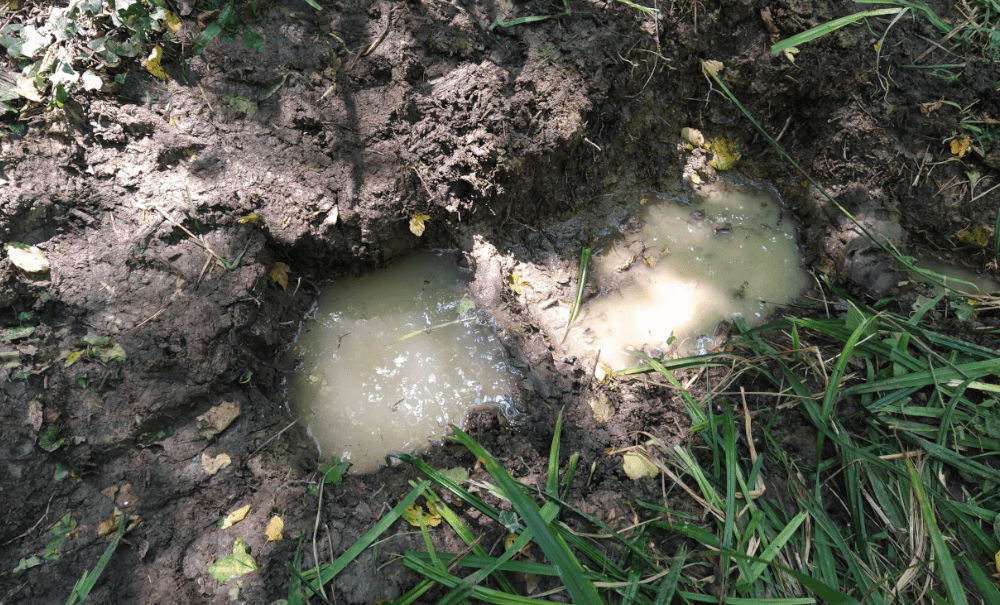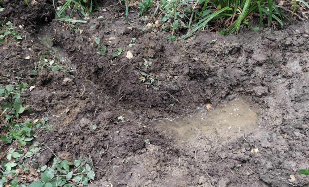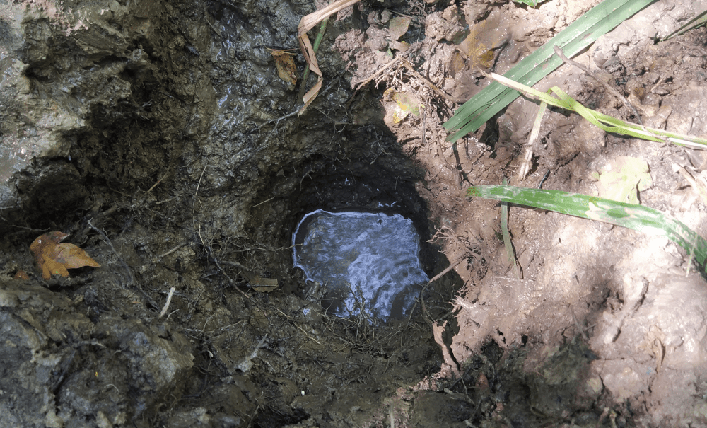 Alors on creuse. On fait 5 trous profonds d’une dizaine de centimètre le long d’un écoulement probable. Tous se remplissent d’une eau claire qui semble suinter du sol.