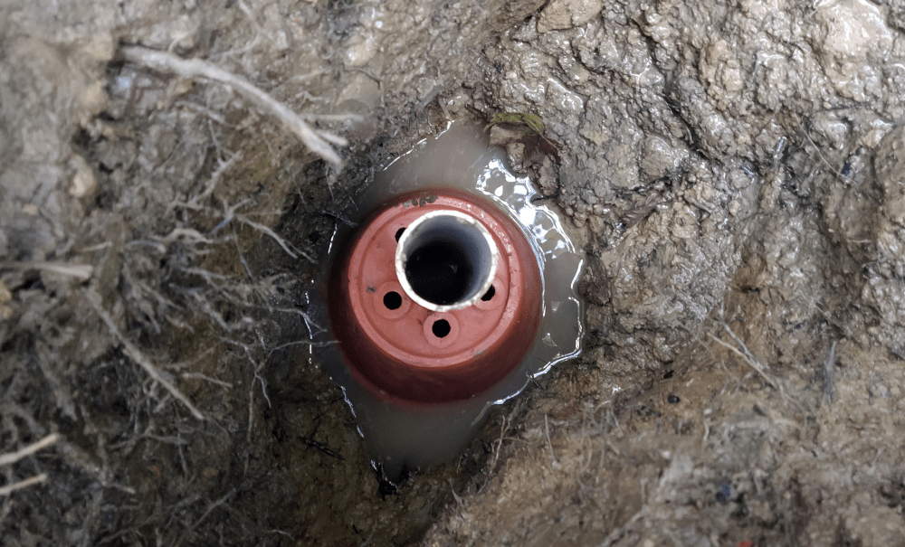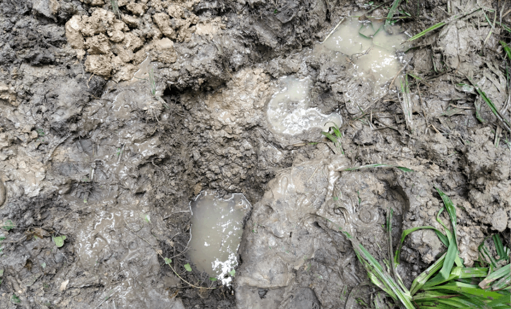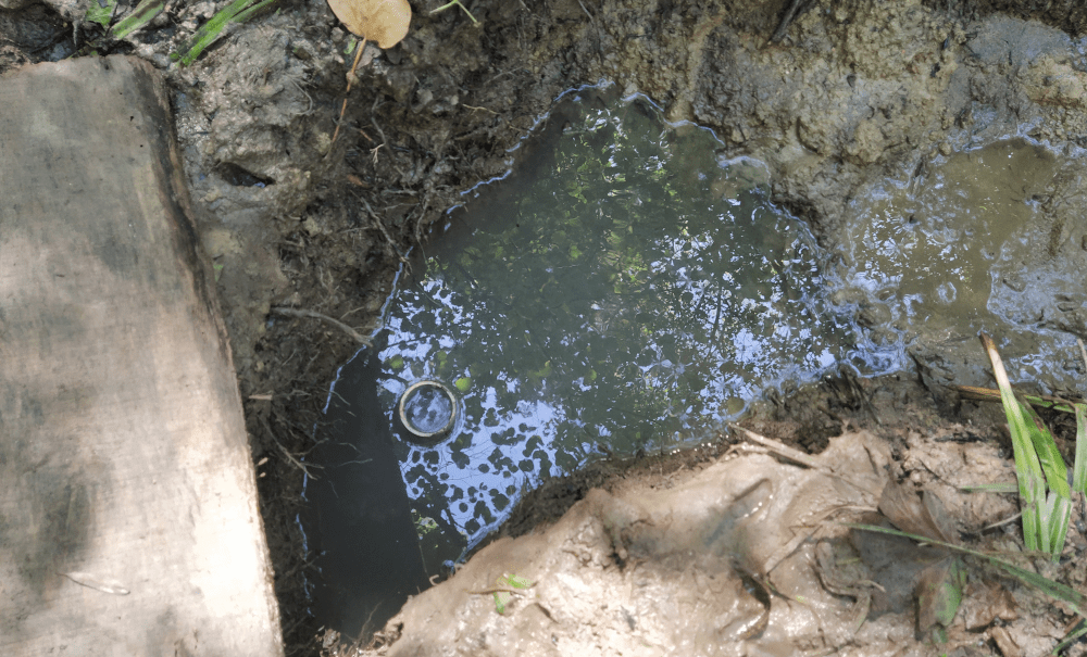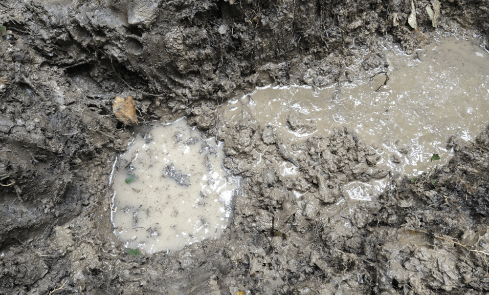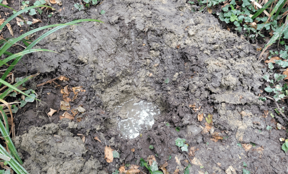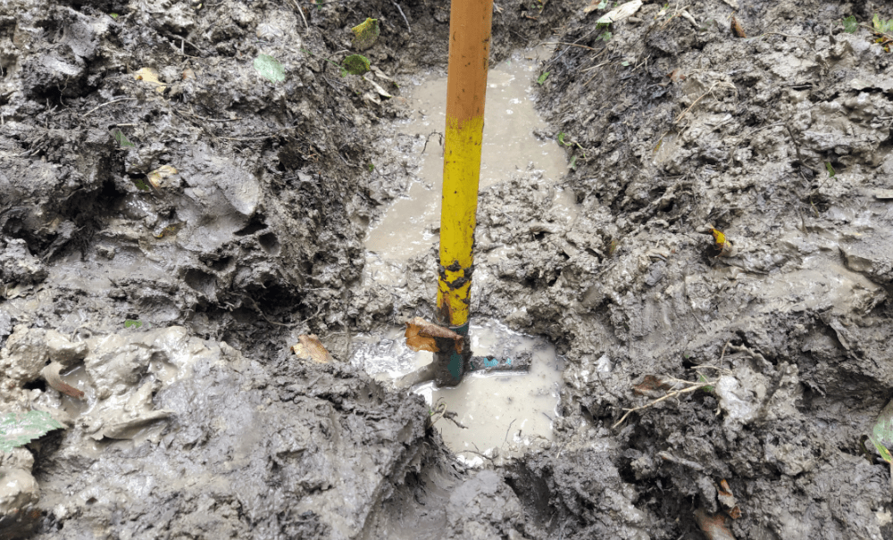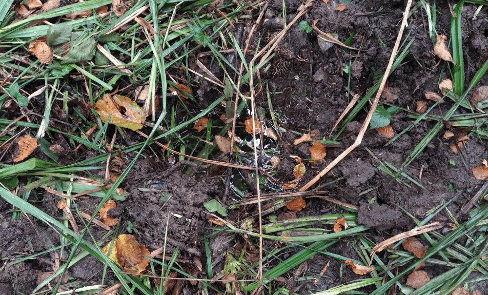Alors on creuse. On fait 5 trous profonds d’une dizaine de centimètre le long d’un écoulement probable. Tous se remplissent d’une eau claire qui semble suinter du sol.