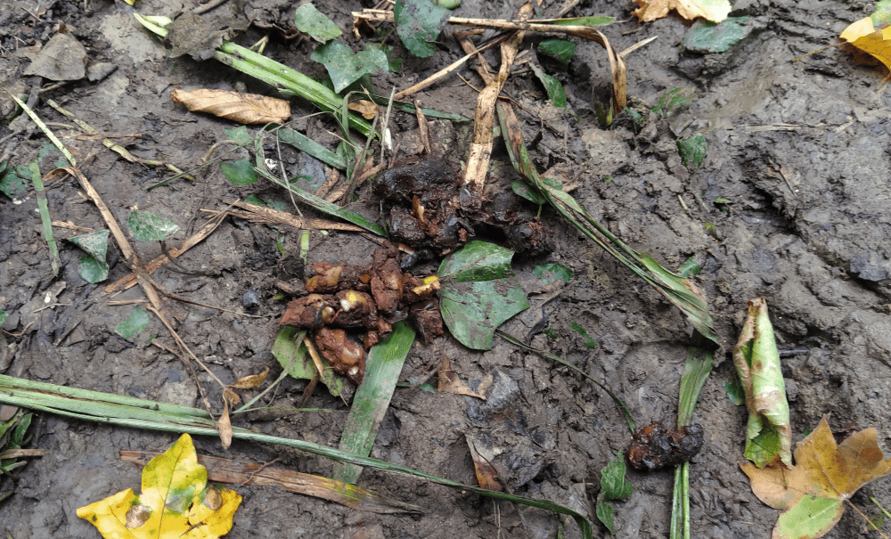 On retourne à la place originelle, en espérant trouver la résurgence principale (qui serait plutôt une exsurgence). On remarque qu’à 2 jours d’écart, des visiteurs ont laissé une trace de leur venue (Groingroin et Bibiche, le chevreuil hydroscope). Et ben, là aussi, on se dit que ce doit être un signe (woui, le caca; c’est plus logique qu’un dessin!).