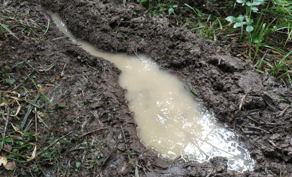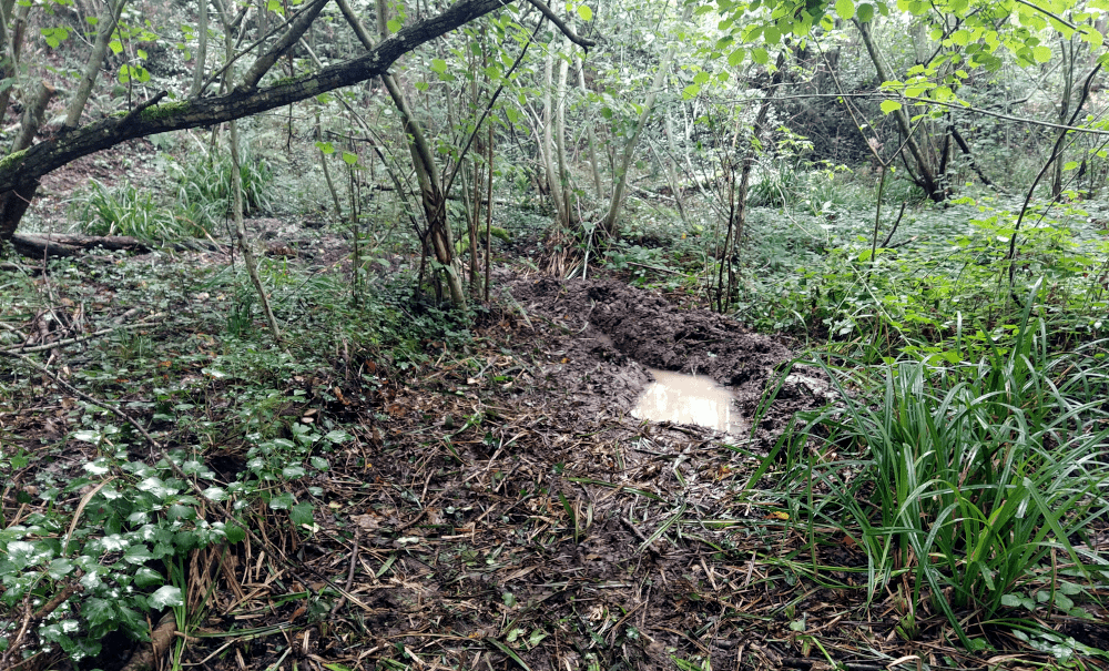 Pour étudier l’entrée de l’eau, on doit la sortir du trou. De fait, on creuse deux déversoirs (mini-mares) reliés par un sillon (une mini-canalisation) sur la moitié de la descente. Au bout, l’eau effleure le sol.