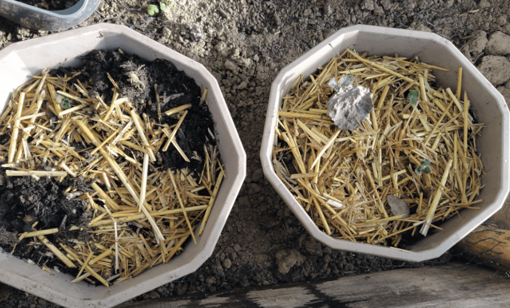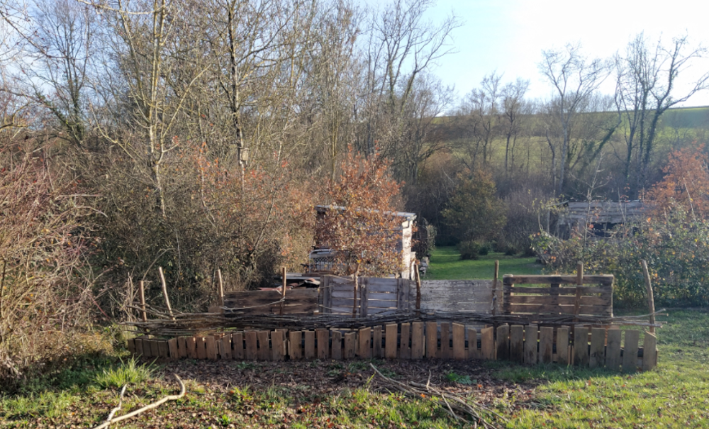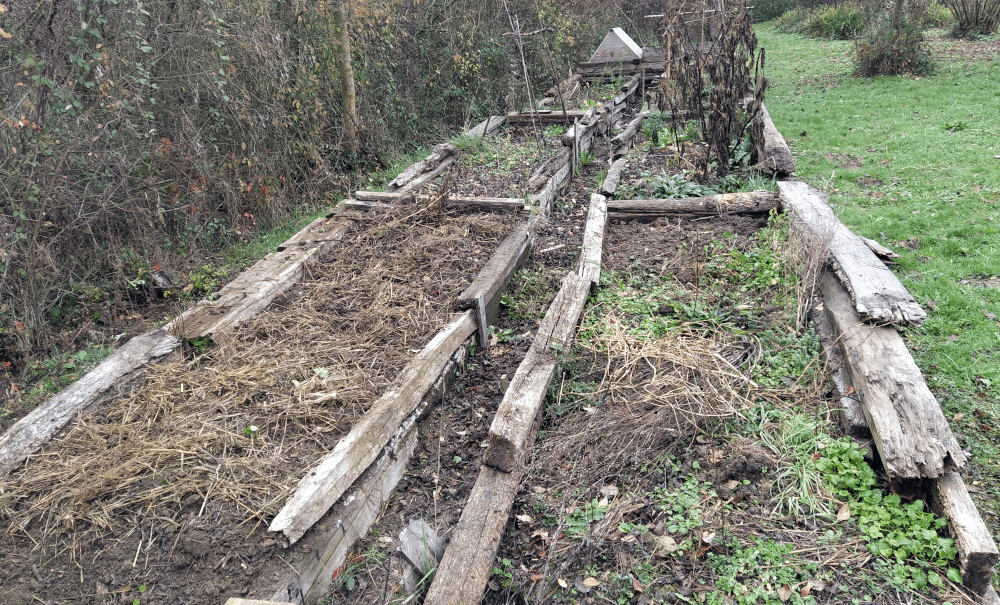 Puis on complète les bacs de culture (dans les palettes) avec les clématites récupérées au potager. Peut-être qu’avec ces grimpants, l’ouvrage tiendra plus de 2 ans?