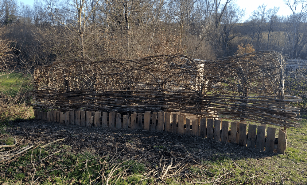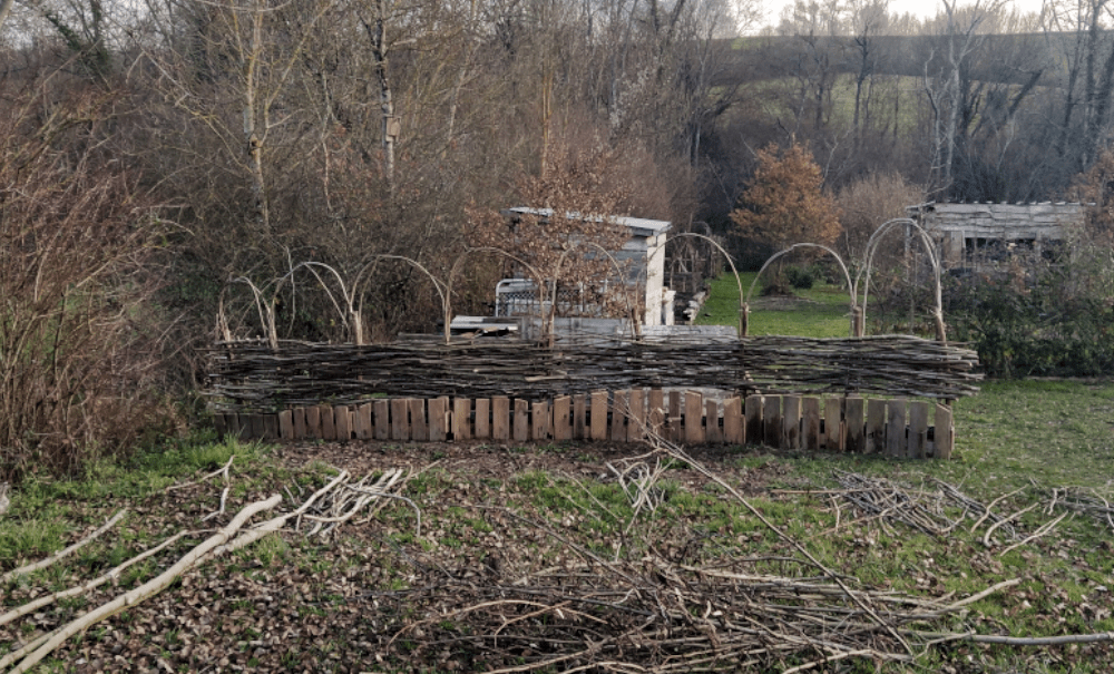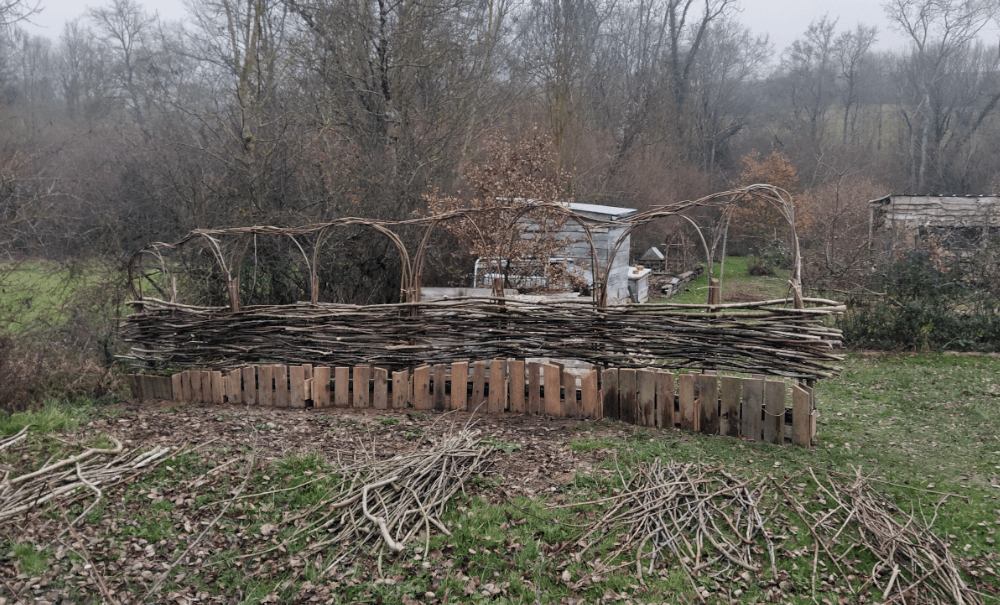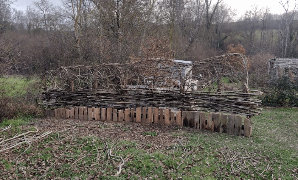 La matière prête, on peut enfin réaliser le plessis de notre brise-vue (commencé en octobre). Là encore, il faut s’armer de patience. Non seulement c’est long mais en plus nos mains sont congelées. Pourtant, il faut tresser tant que le bois est tendre.