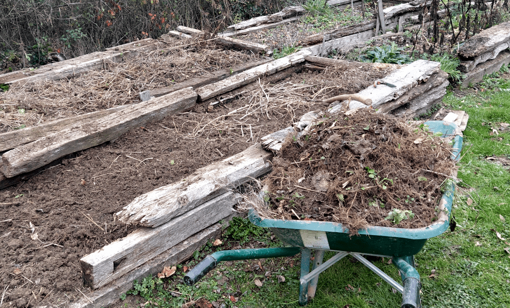 On a bêché quatre des six planches de culture pour en retirer 6 brouettes de racines et adventices. Les deux autres planches ont simplement été désherbées et aérées (et 2 brouettes de plus!).