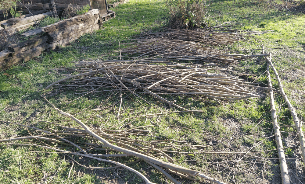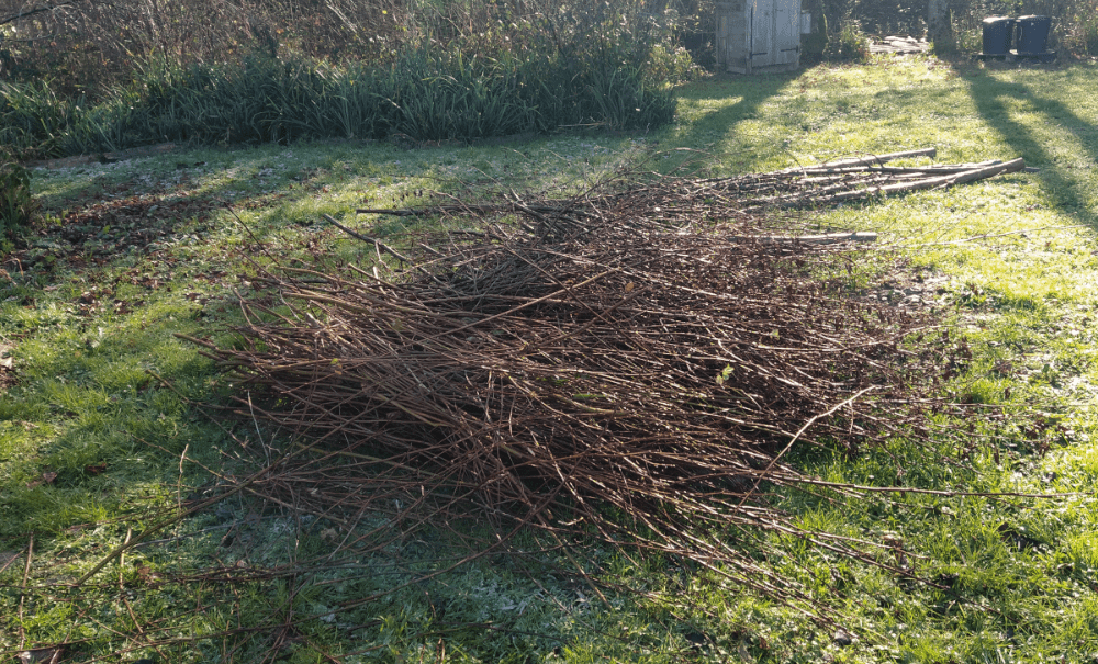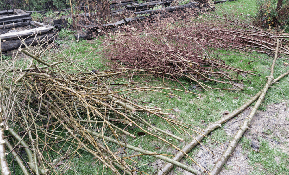 … en l’air, car au sol, un amas de branchouilles fait son apparition. C’est là qu’on commence l’opération plessis. Il faut tout d’abord trier et préparer les branches au tressage (c’est à dire conserver les rameaux les plus long et tailler leurs brindilles). Un travail de fourmi…