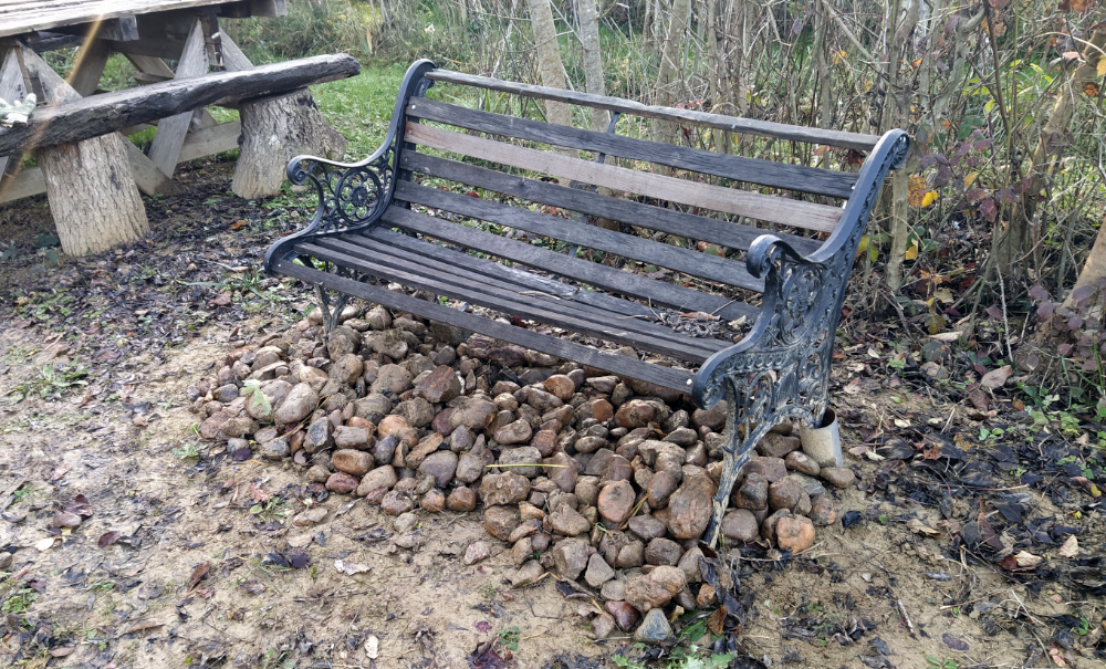 Pour ce faire, on a dû déplacer notre tas de cailloux excavé lors du nettoyage de l’espace aquatique. Mais n’étant pas d’humeur à faire du stone stacking, on les jette sous le banc en attendant…