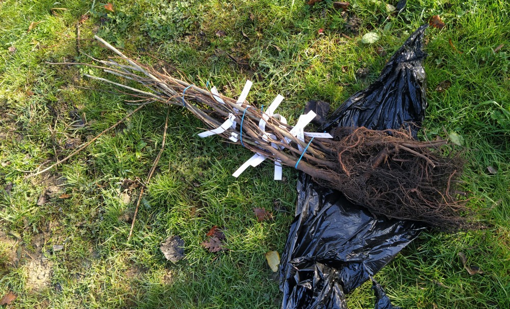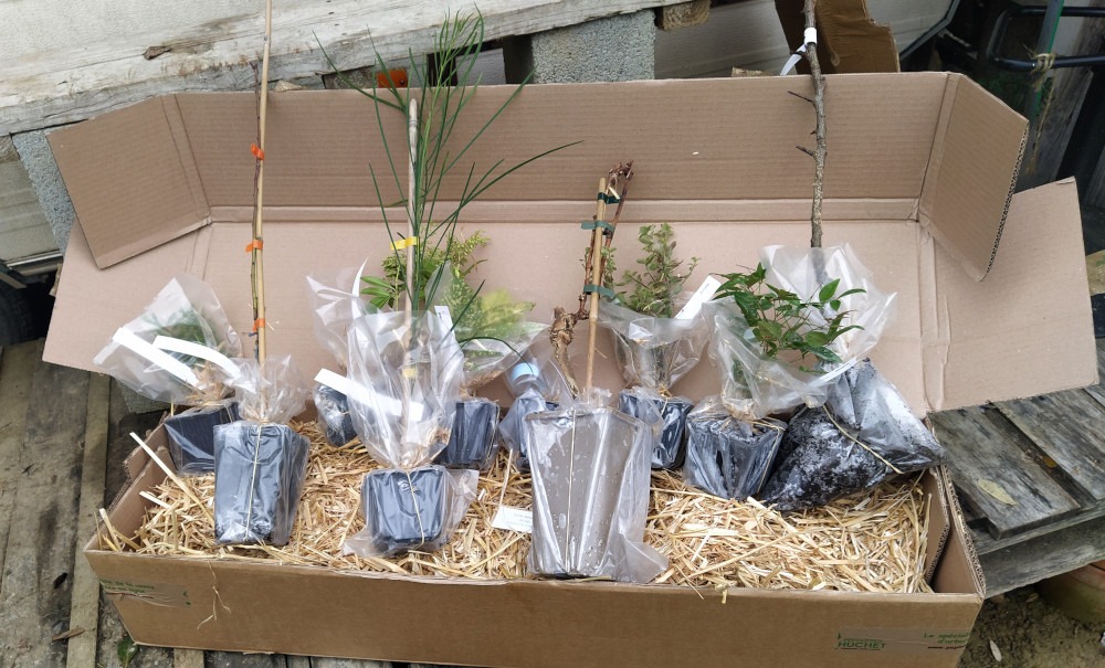 On a passé commande auprès de 2 pépiniéristes. D’abord, et pour la seconde fois, on pré-commande (il y a plus d’un mois) au jardin des Gazelles. On n’est pas convaincu par l’état des arbres en racines nues. Ils sont arrivés 5 jours après expédition (GRRR! transporteur qui ne livre pas les week-ends!!!!!!!!!) et le conditionnement est limite (le plastique pour contenir les racines est sec). Mais bon, ils sont plutôt beaux.