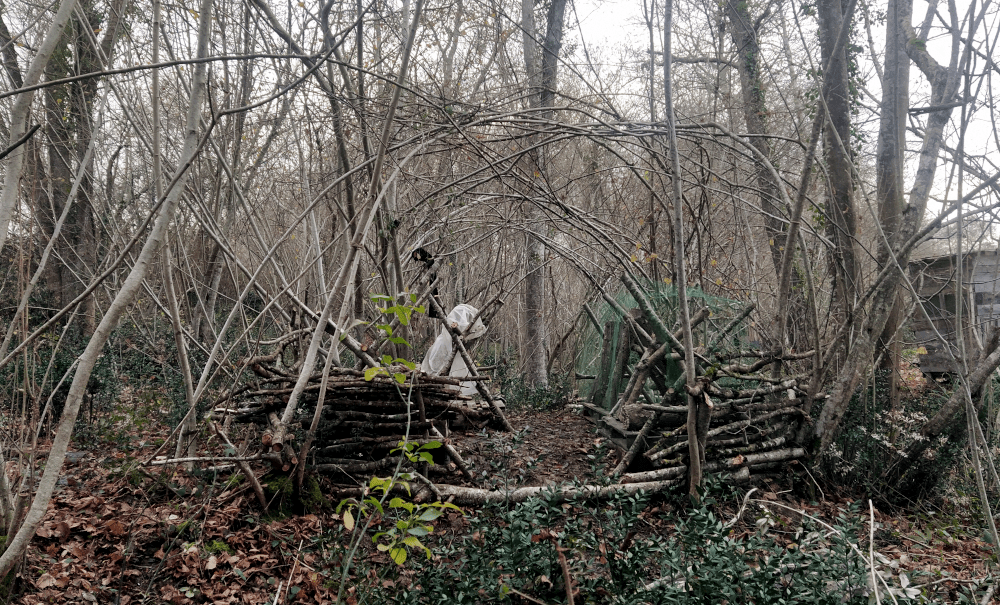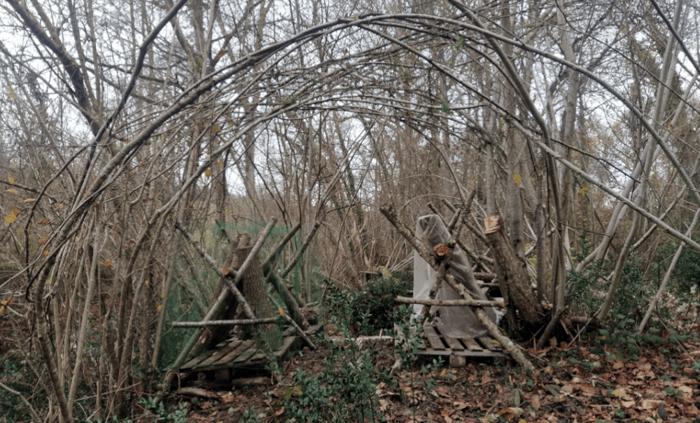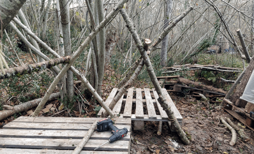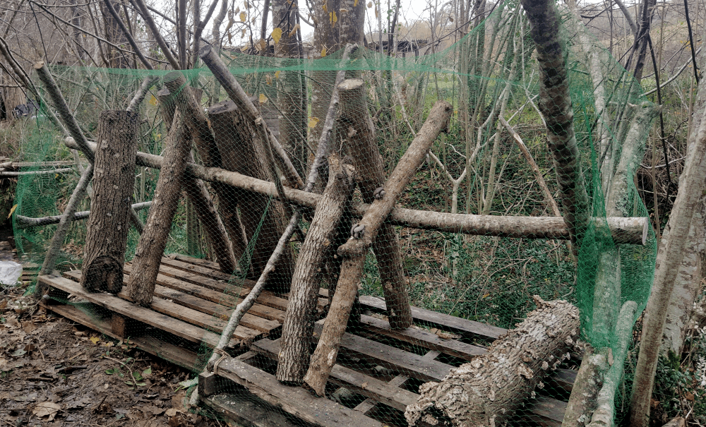 Après moultes réflexions, on réinstalle les troncs sur des palettes (il nous semble qu’ils subissent moins d’attaques de bestioles en hors-sol). Du coup, on fixe les tréteaux dessus et on peut enfin remettre les branches en production à la verticale. Puis on pose un filet anti-oiseau, en vérifiant quotidiennement qu’aucun animal ne s’y empêtre (au moindre problème, on l’enlève, c’est promis!).