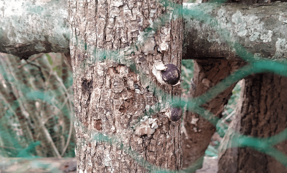 On prévoit prochainement d’ajouter une maille de cuivre (anti-limace) aux pieds des troncs. Pour l’heure on récolte toujours quelques pleurotes et des shiitakés.