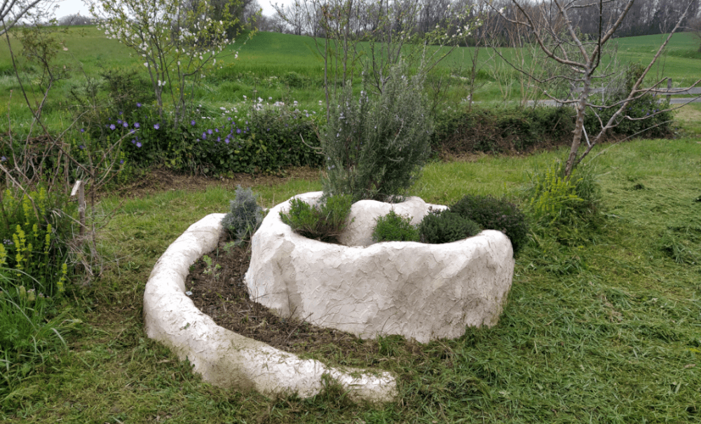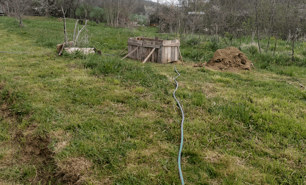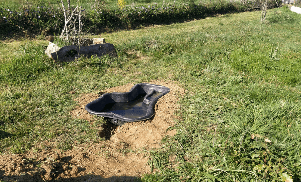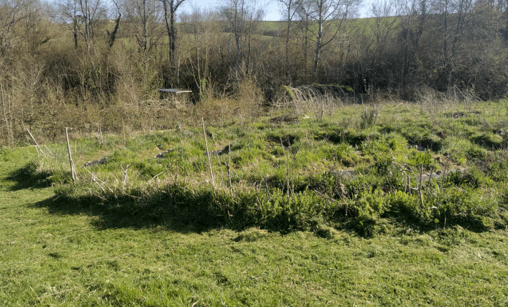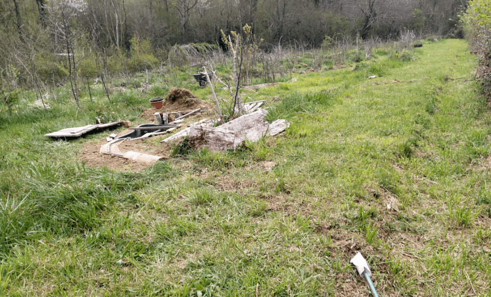 Parmi toutes les solutions envisagées jusqu’alors, aucune n’a été retenue. Et c’est en éclaircissant le labyrinthe qu’une nouvelle idée est apparue : et si on aménageait un point d’eau pas très loin pour arroser nos plantes médicinales et aromatiques ? En utilisant le fossé de la haie, on peut faire descendre un tuyau qui alimenterait un bassin. En plus, si on garde une partie de ce tuyau accessible, on peut arroser la haie (au besoin).