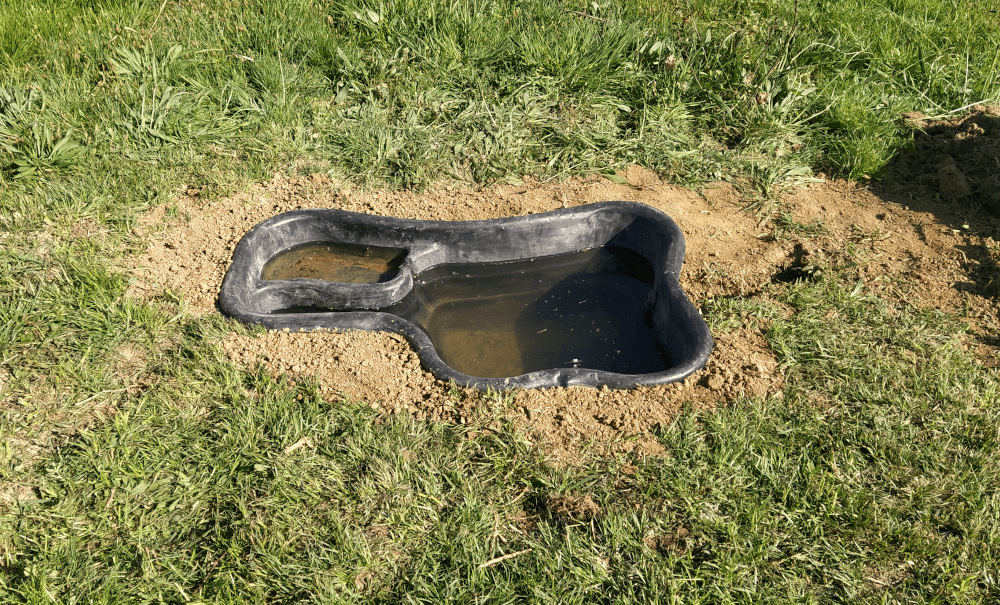 Bref! On creuse et on pose le bassin, aidé de Gilles (Merci Gilles!). Puis on raccorde la dérivation du trop-plein vers le bassin. Puisqu’il risque de déborder, on fait un trop-plein au bassin qui se déversera dans le fossé de la haie (retour à l’envoyeur!).