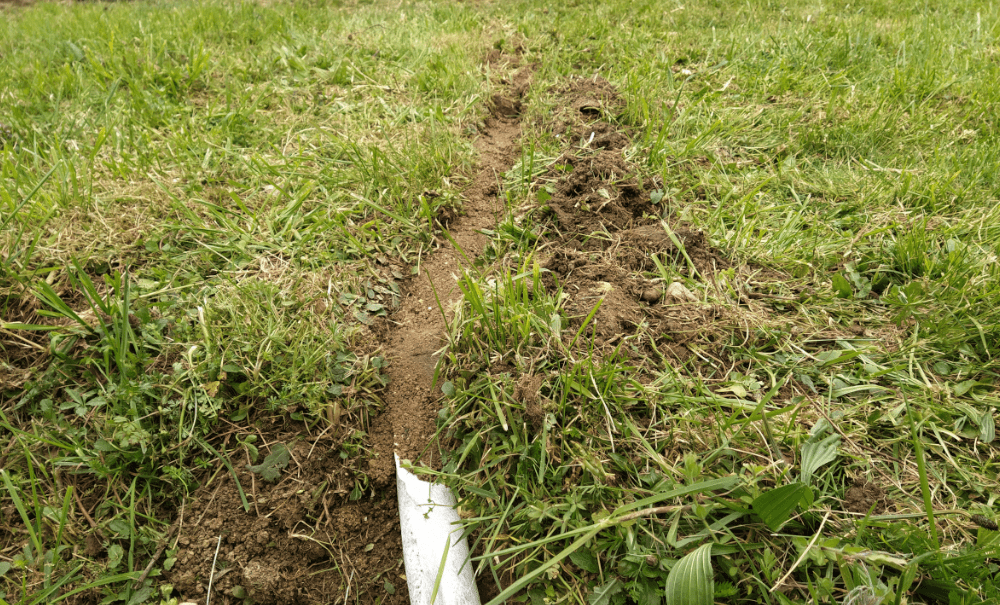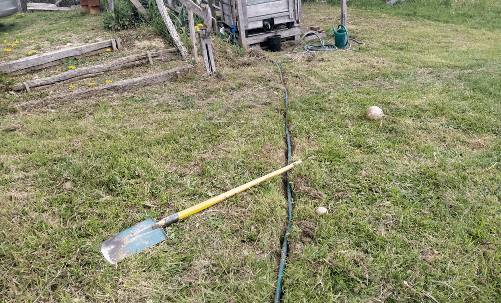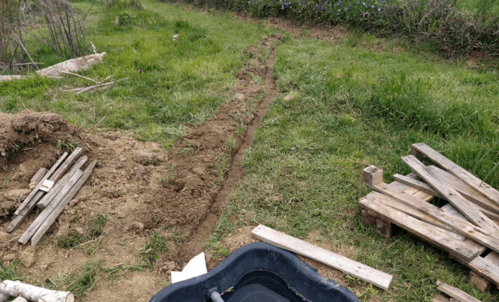 On décide d’enterrer tous les bouts de tuyaux qui traversent le cheminement. C’est quand même plus pratique! Donc, on creuse donc 3 sillons. On les nivelle avec du sable. On entoure les tuyaux dans du géotextile, on couvre de sable puis de terre.