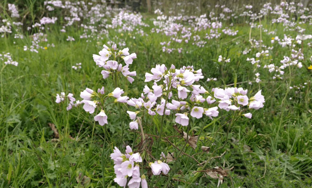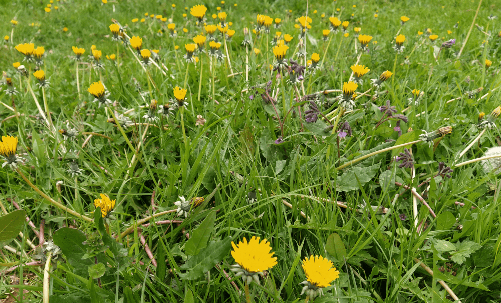 Puisque le terrain est parsemée de fleurs, on présente celles qui sont actuellement en nombre visuellement conséquent : l’alliaire, le pissenlit (de son nom botanique : Taraxacum officinale), la cardamine des près, la pulmonaire..