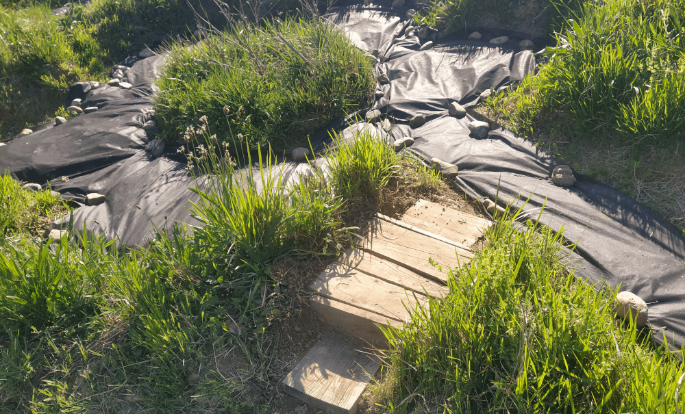 Puisqu’il y a également de grande chance pour que le bassin soit à sec, on envisage un aménagement adéquat. En plus, le plastique noir dans le sol, c’est vraiment pas beau. Affaire à suivre…