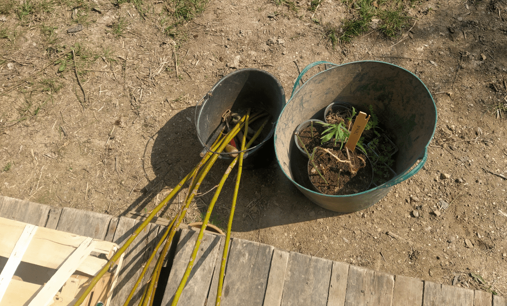 Puis, on trouve 3 pots de nigelle, des hémérocalles rouges, des boutures de jasmin d’été et des branches d’osier à la bourse aux plantes de l‘association Vivre en Comminges. On plante les nigelles en zone prairie et les hémérocalles en zone sauvage. On place l’osier en bouture dans la haie Jean-Luc.