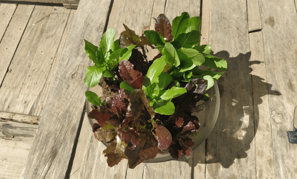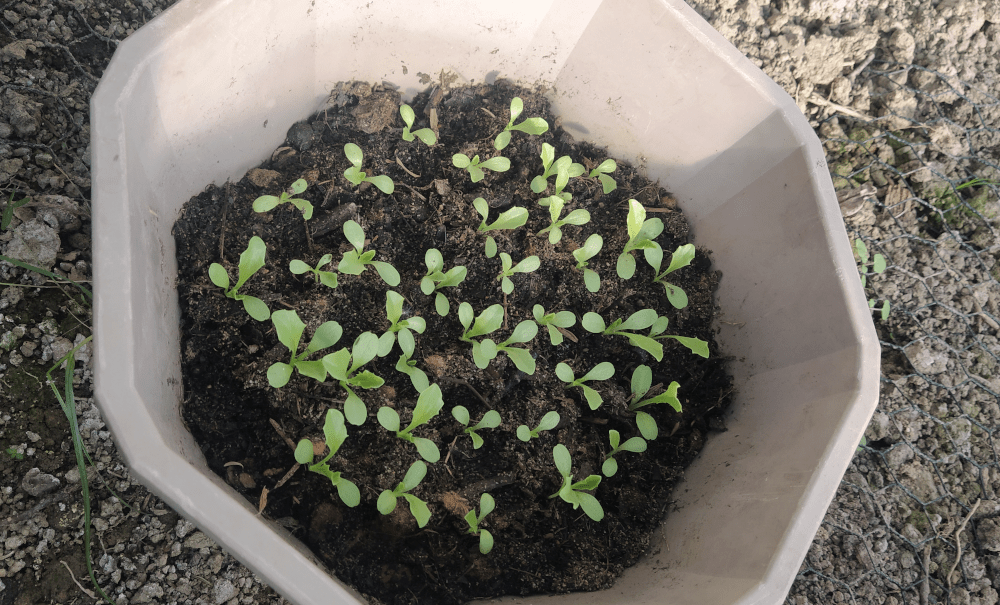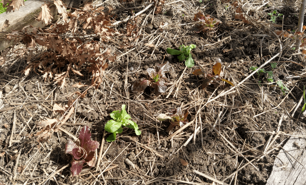 On récupère à droite et à gauche quelques plants qu’on installe par-ci par-là. Déjà, 14 bébés salades vivaces sur 2 plates-bandes du potager (Merci Mario!).