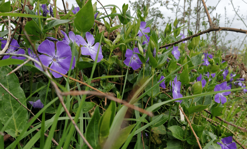 On commence par la haie (Jean-Luc), côté prairie. Ici, on dégage le petit fossé de toutes les ronces et pervenches qui s’y étendent. En les coupant du sol, elles ont tendance à remonter; ce qui tord moins nos petits arbres et arbustes. Il faut dire que les pervenches sont très envahissantes, mais que c’est beau!