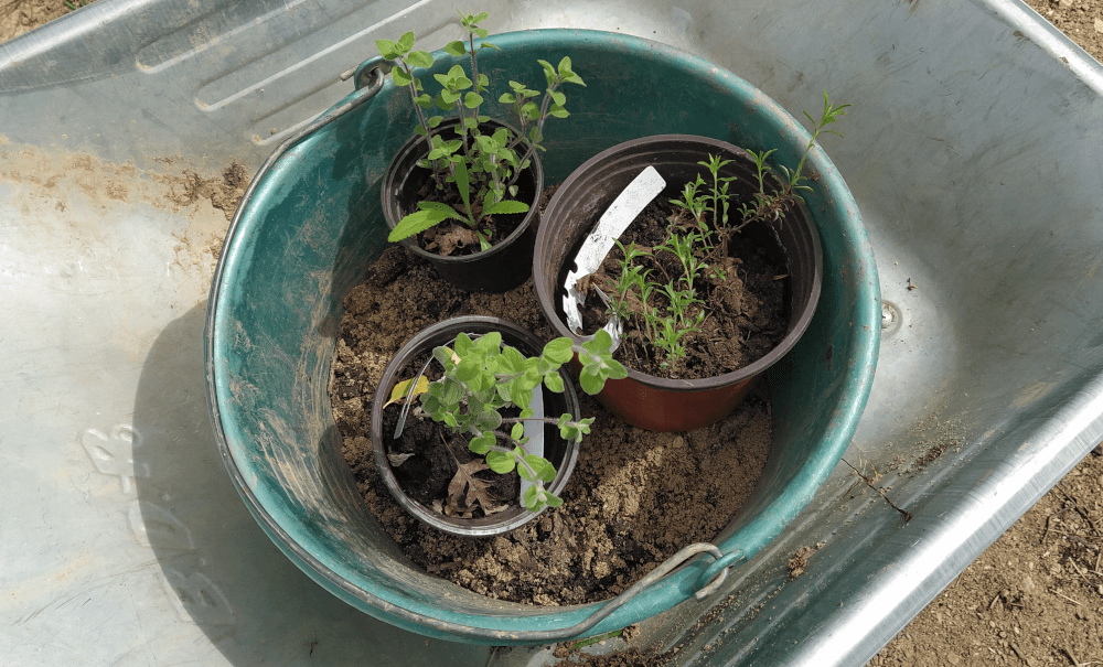 On plante aussi origan, sarriette et origan libanais dans la spirale aromatique. On profite de l’occasion pour entretenir un peu l’ouvrage. L’enduit ciment posé en janvier de l’an passé a globalement bien tenu. Seules quelques fissures sont apparues quand on a déraciné des plants.
